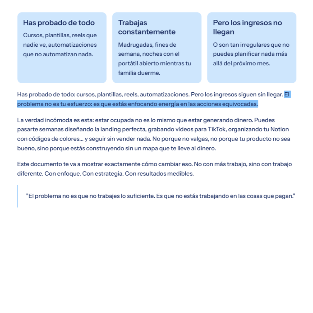 Cada paso de esta guía está diseñado para ayudarte a reenfocar tu tiempo hacia acciones rentables, sin complicaciones ni sobrecarga.